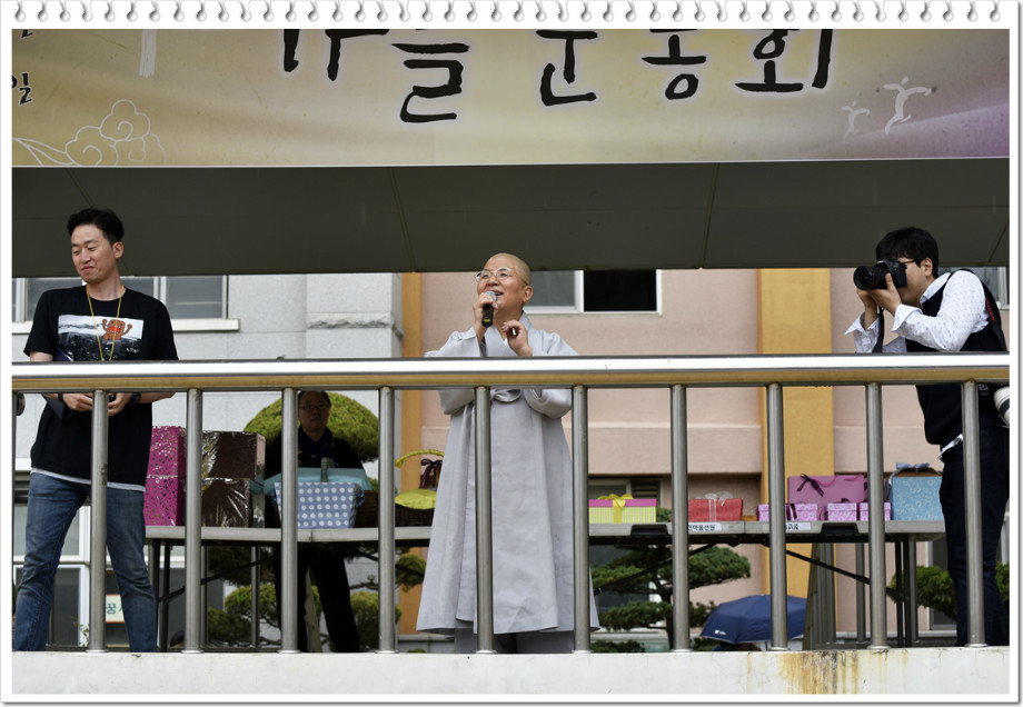 법당을 나서니 계단 사이로 바자회 행사장이 얼핏 보입니다.