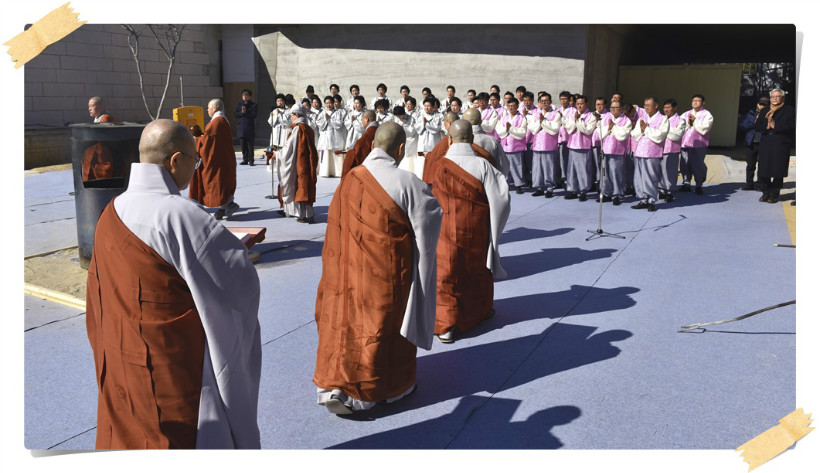 어린이 법당 앞 마당에 준비된 소대(燒臺)로 향하시는 스님들.