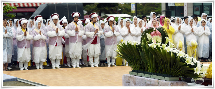 사부대중의 한글 독송이 가랑비 소리에 녹아들며 법계에 울려 퍼집니다.