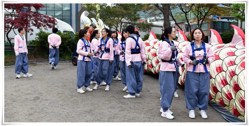 연희단들도 모두 비옷을 걸치고 동참했습니다.