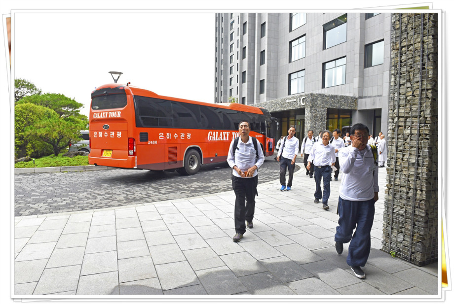 버스에서 내려 수련회장으로 모이는 거사분들.