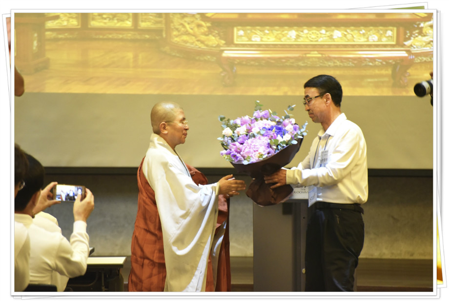 신도회장님이 이사장 혜수스님께 꽃공양을 올렸습니다.